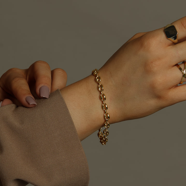 A bold Rambo Chain Bracelet crafted from 9 Carat Gold, showcasing thick link chains for a stylish statement.