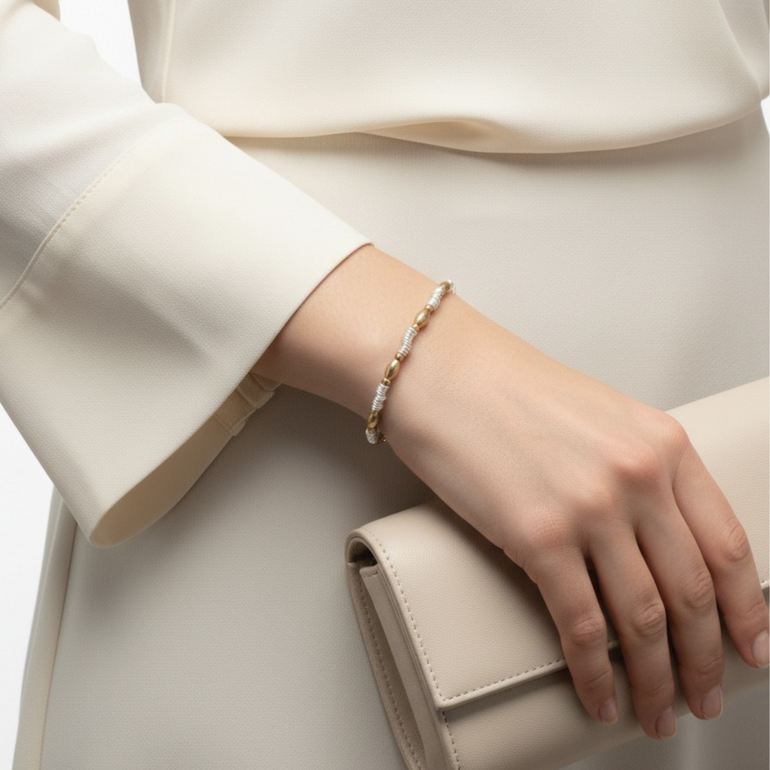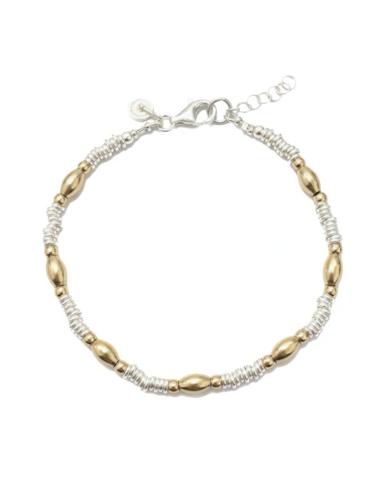 The design alternates between sleek golden ovals and ribbed silver coils, connected by delicate round spacer beads that enhance the bracelet's fluid rhythm. The corrugated silver sections catch and reflect light through their grooved surfaces, while the smooth gold ovals provide warm, lustrous contrast.