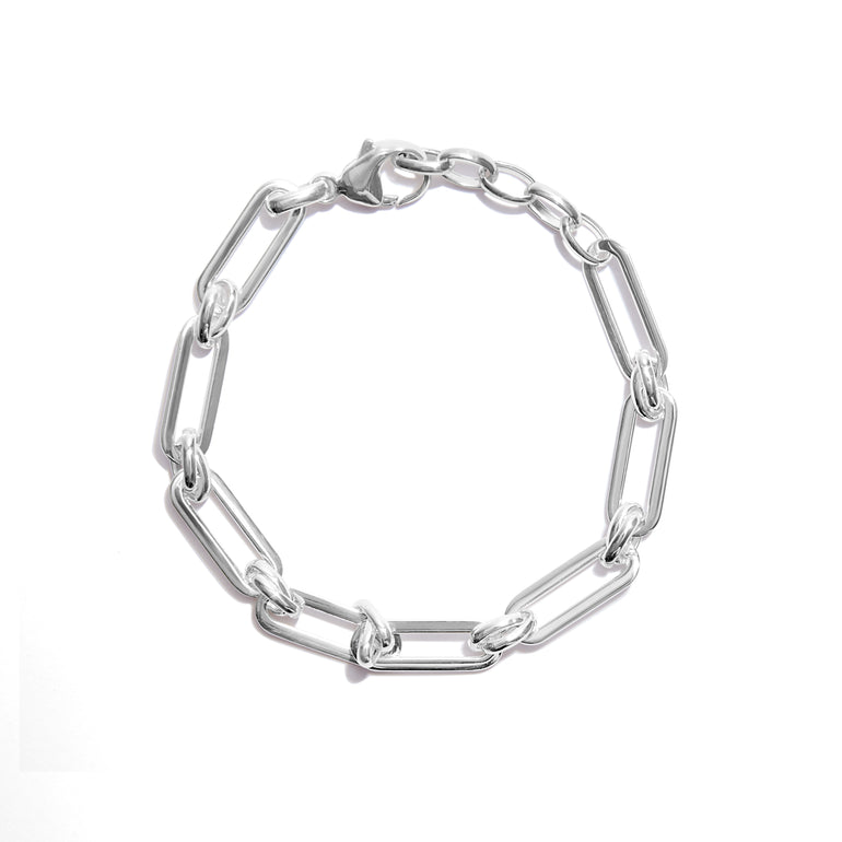 This is a silver bracelet featuring large, rectangular chain links connected by smaller circular links. The bracelet has a polished, shiny finish, and the clasp appears to be a lobster claw clasp, ensuring secure fastening. Its minimalist design gives it a sleek, modern look, making it versatile for both casual and formal wear. The geometric shape of the links adds a bold, contemporary touch to the piece.