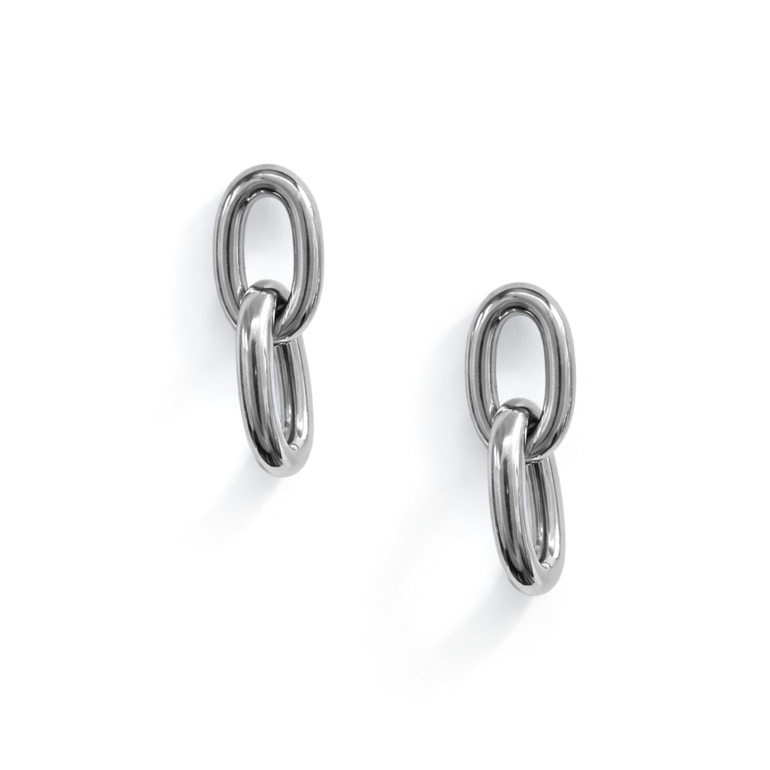 These sterling silver drop earrings feature a bold yet minimal linked design that brings a modern edge to a timeless style. Crafted from polished sterling silver, the elongated oval link connects seamlessly to a rounded link below, creating a fluid silhouette that moves gently with wear. The smooth, high-shine finish reflects the light beautifully, adding a subtle statement without feeling heavy. Effortlessly versatile, these earrings are perfect for elevating everyday looks while still being striking enough for evening styling.