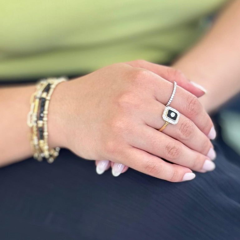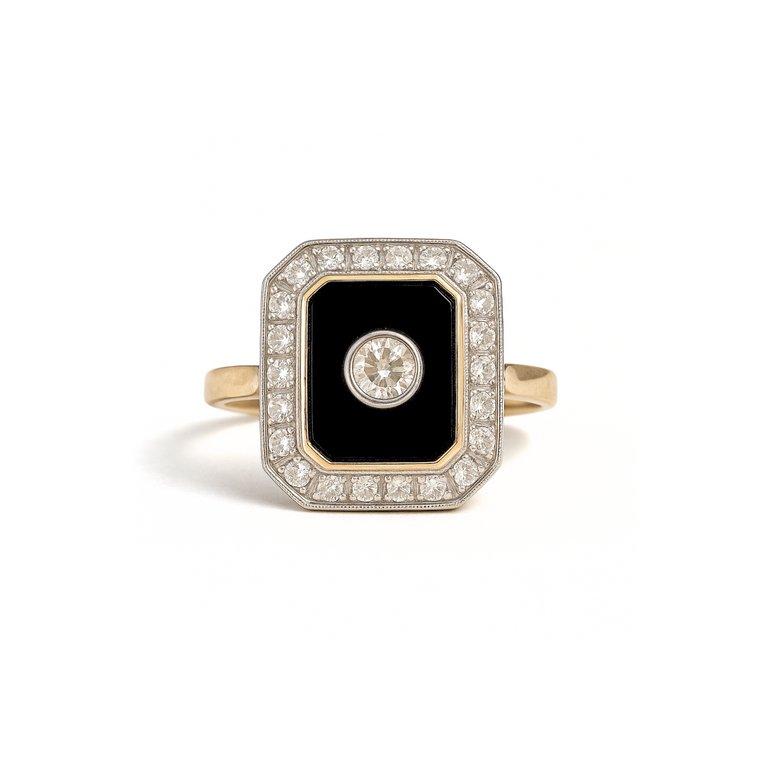 Bold, elegant, and timeless — this ring is a stunning tribute to vintage glamour. Set in solid 9ct yellow gold, a sleek black onyx inlay provides a striking contrast to the brilliant center diamond, bezel-set for a clean, modern finish. Surrounding the onyx is a radiant halo of shimmering diamonds, arranged in a geometric octagonal shape that echoes the elegance of Art Deco design.