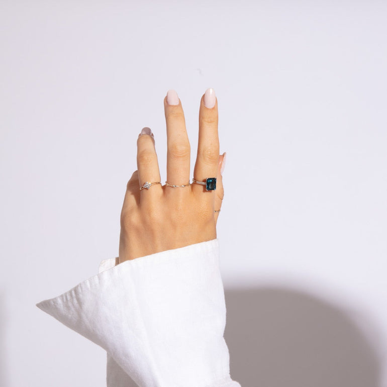This striking ring showcases a breathtaking 4.32ct emerald-cut London blue topaz centerpiece in a classic four-prong setting. The elegant 9ct gold band features 0.08ct diamond-accented shoulders with delicate milgrain detailing, perfectly balancing the substantial azure gemstone with refined vintage-inspired character.