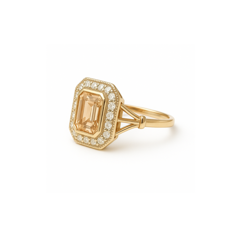 Exquisite 9CT gold ring featuring a 0.56 CT opal centerpiece that displays a stunning play of colors, flanked by 0.70 CT of rich blue sapphire baguettes and accented with 0.07 CT of sparkling diamonds. This Art Deco inspired design with intricate milgrain detailing creates a perfect balance of vintage charm and modern elegance.