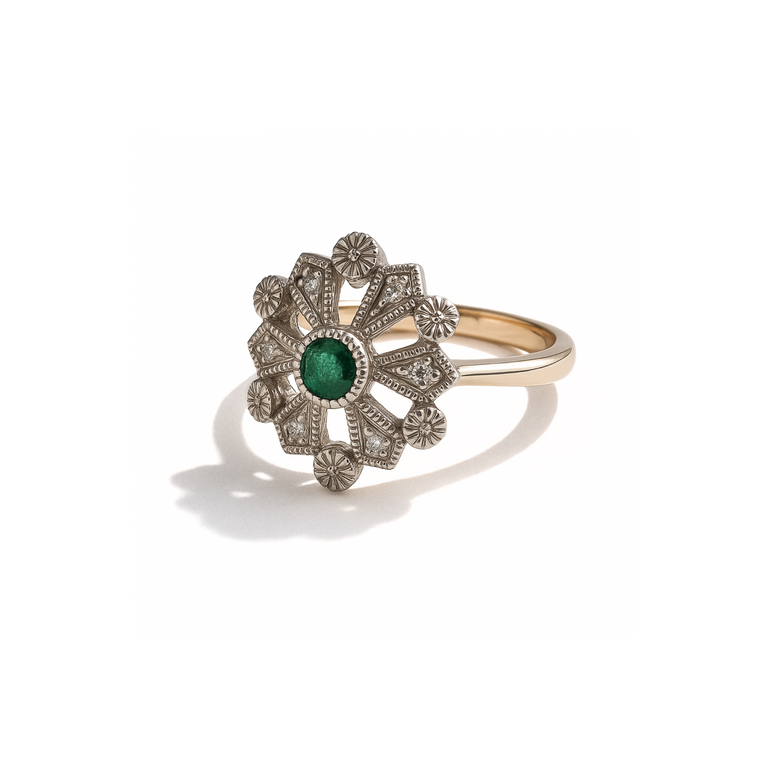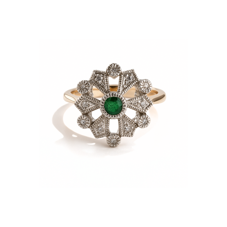 This stunning vintage-inspired ring showcases a vibrant round emerald nestled within an intricate starburst setting of sparkling diamonds. Crafted in 9ct gold with a beautiful contrast between the warm yellow gold band and the detailed white gold top, this piece captures the essence of Art Nouveau elegance.
