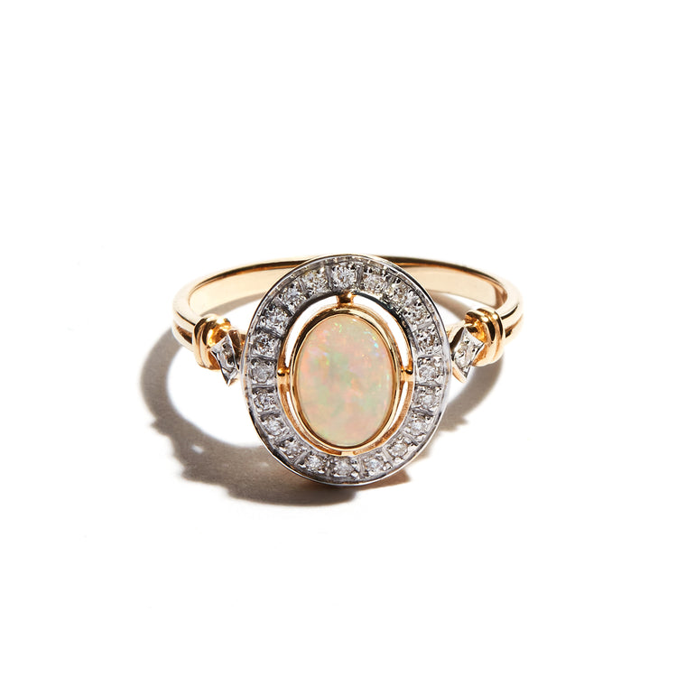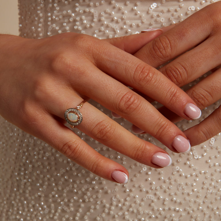 - Oval cut Opal centre with surrounding diamonds