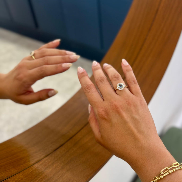 Elegant with a touch of old-world glamour, the 9ct Vintage Halo Gemstone Ring showcases a vibrant round-cut center stone — in London Blue Topaz, — surrounded by a delicate floral-inspired halo of 14 lab-grown diamonds (approx. 0.30 ct total). The milgrain detailing and scalloped edges lend a refined vintage charm, while the polished gold band provides a contemporary contrast. A perfect statement of timeless beauty and color.
