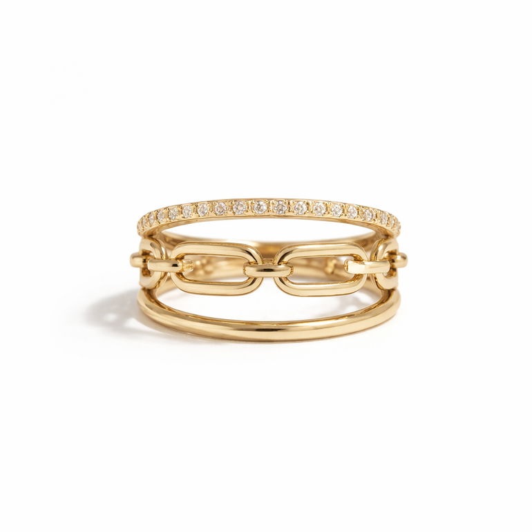 Make a bold statement with this contemporary triple-band ring, expertly crafted from 9ct solid gold. The design features three distinct elements: a sparkling pavé-set band adorned with brilliant stones, a sleek chain-link center band, and a smooth polished band below. This modern stacking ring creates the illusion of wearing multiple rings while maintaining the comfort and security of a single piece. The luxurious gold finish and mixed textures add depth and visual interest, making it a standout addition to any jewelry collection.