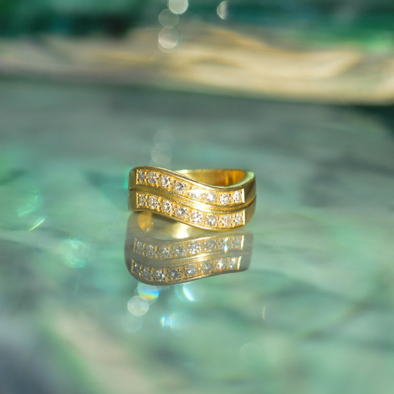 This elegant 18ct Two Row Wave Vintage Ring is crafted in 18ct yellow gold and features a graceful wave design. Adorned with sparkling 0.35ct diamonds, it exudes timeless charm and sophistication. A perfect vintage piece for any jewelry collection.