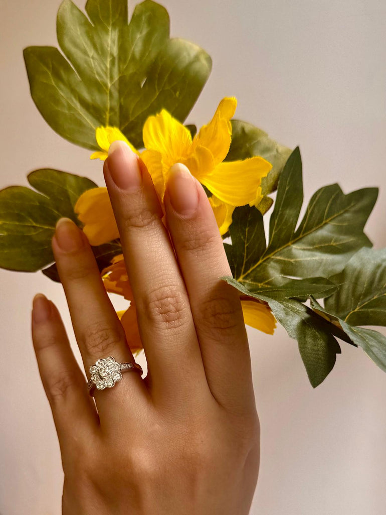 This enchanting 9ct solid white gold ring showcases a magnificent floral cluster design with a total diamond weight of 0.69 carats. The arrangement features a square-cut center diamond beautifully framed by eight round brilliant diamonds, all enhanced with delicate milgrain beaded edges. The band is further adorned with diamond accents, creating a luxurious vintage-inspired piece that captures light from every angle. Perfect as a statement engagement ring or special occasion jewelry.