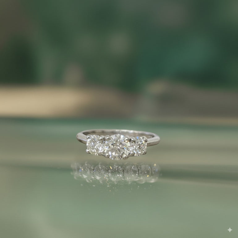 A timeless platinum ring featuring 1.17 carats of brilliant round diamonds in a classic three-stone setting, symbolizing past, present, and future.