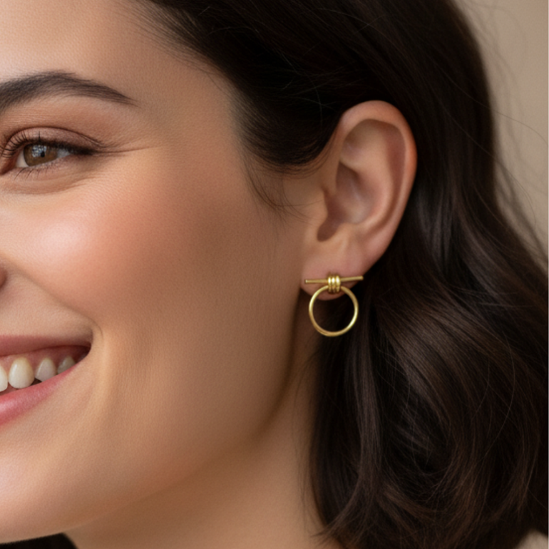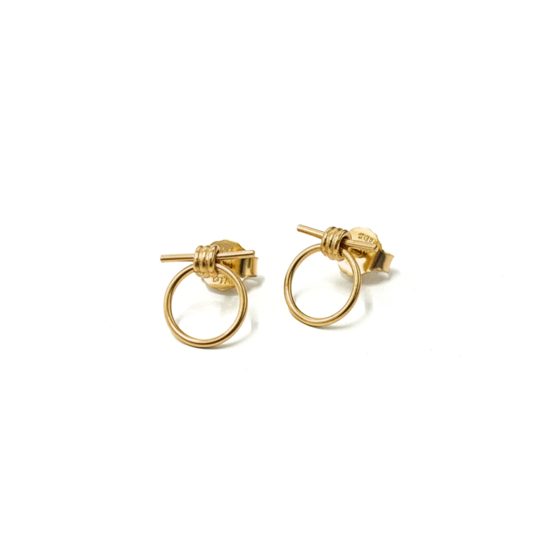 Minimalist earrings with a contemporary design that combine elegance and sophistication. Crafted in 14ct gold filled, these studs feature a delicate circular hoop intersected by a horizontal bar with a knot detail, creating a unique sculptural piece. Their versatile design makes them the perfect complement for both everyday wear and special occasions.