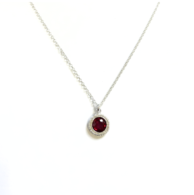 This July Birthstone Pendant is made from Sterling Silver. Its design features a handwoven crochet bezel surrounding a radiant ruby-inspired crystal, symbolizing love, passion, and vitality.