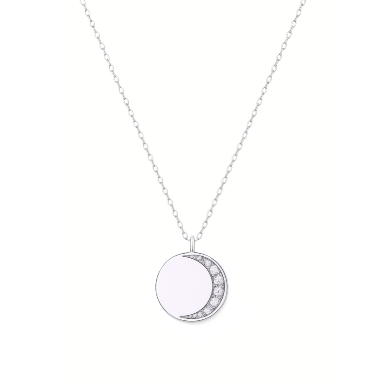 This beautiful crescent moon pendant is made from quality sterling silver with sparkling cubic zirconia stones along the curve. The moon symbol represents new beginnings, dreams, and hope.