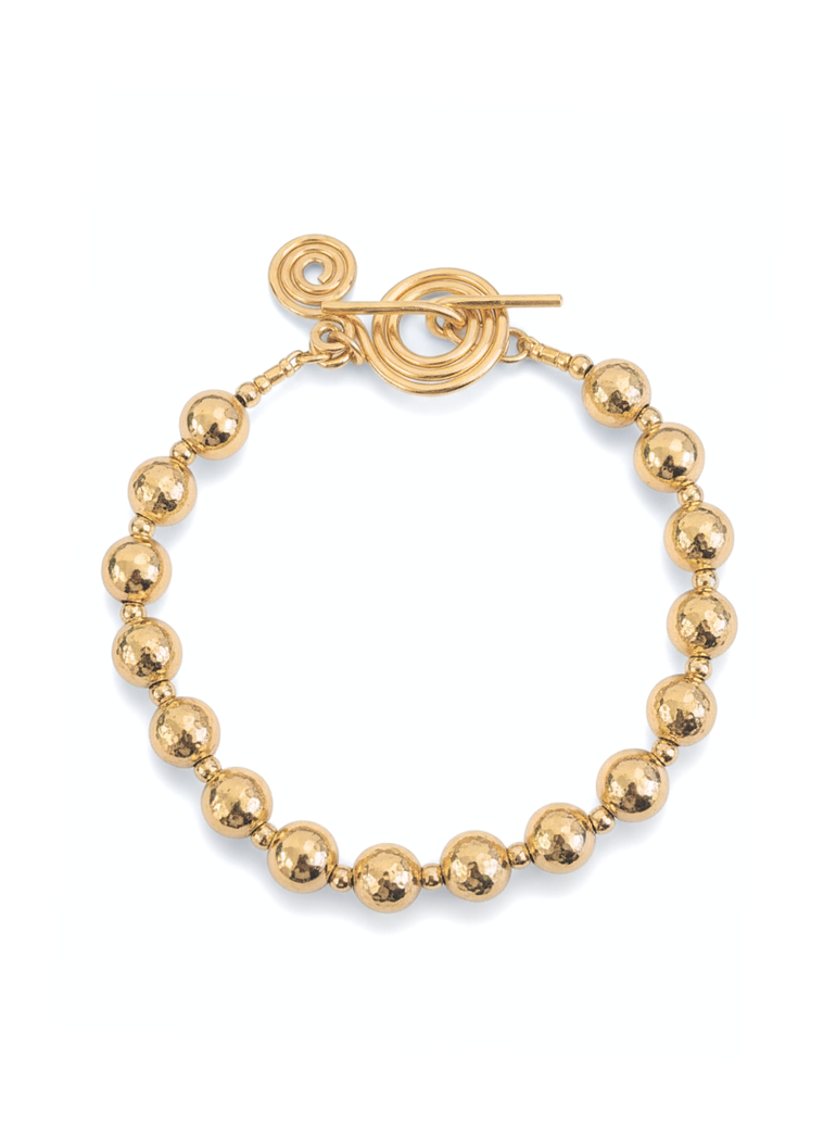 This bracelet is handcrafted with softly hammered beads in 14ct gold filled, finished with a sculptural toggle clasp that adds a subtle statement touch.
