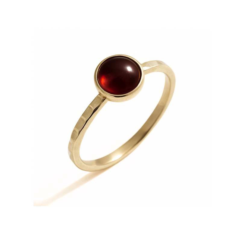 Elegantly handcrafted in 14ct gold filled, the  Garnet Ember Ring features a deep red garnet cabochon set in a sleek bezel. The rich, wine-toned gemstone captures light with subtle fire, while the hammered gold band adds a unique texture that balances boldness with refined minimalism. Ideal for everyday wear or meaningful gifting, this timeless piece blends warmth, durability, and artisanal charm in one radiant design.
