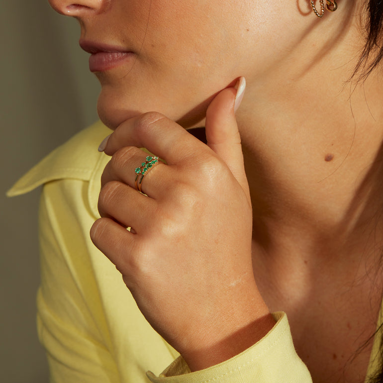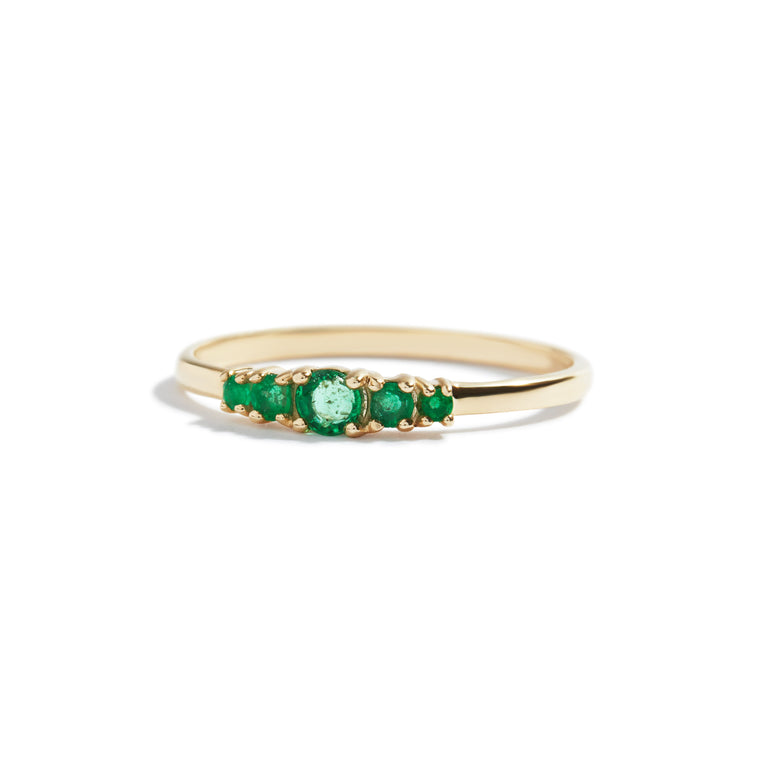 This gorgeous 9 carat gold ring features 5 emerald stones on a simple gold band. It's perfect for stacking or as a beautiful delicate and dainty ring by itself.