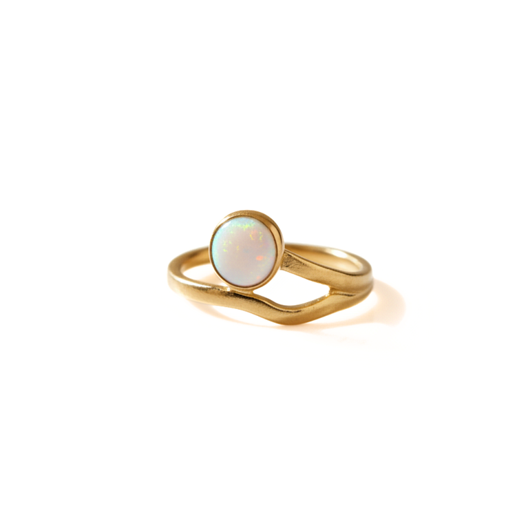 This elegant ring features a luminous opal stone delicately cradled in a modern, open-band design. Crafted in 14ct gold filled, the dual-band silhouette wraps gracefully around the finger, creating a contemporary yet timeless look. The iridescent opal catches light beautifully, displaying subtle flashes of color that make each piece unique. Perfect for everyday elegance or as a meaningful gift.