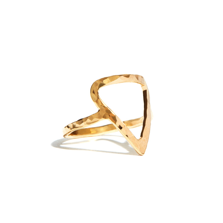 Our Open Triangle Ring is a gold band with a unique open triangle-shaped design. It is made with hammered gold, a Seoidín favourite, to give a distinctive textured finish.- 14 carat gold-fill