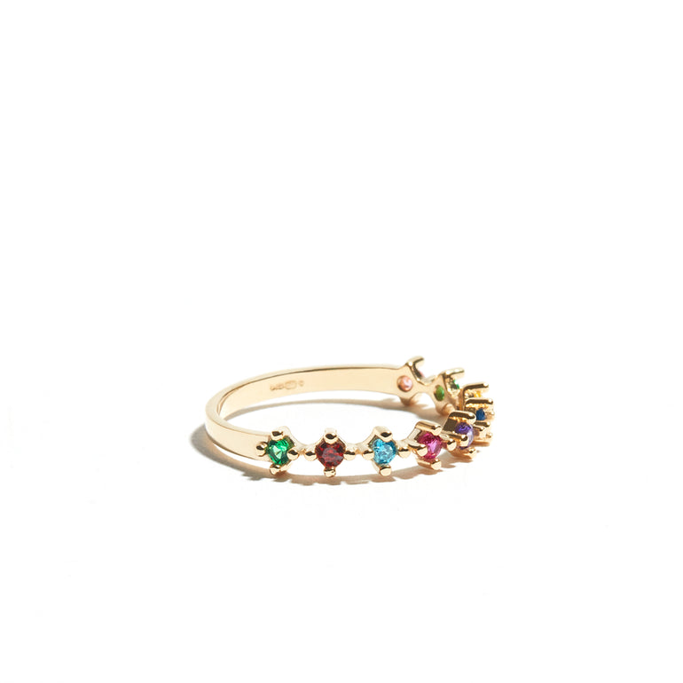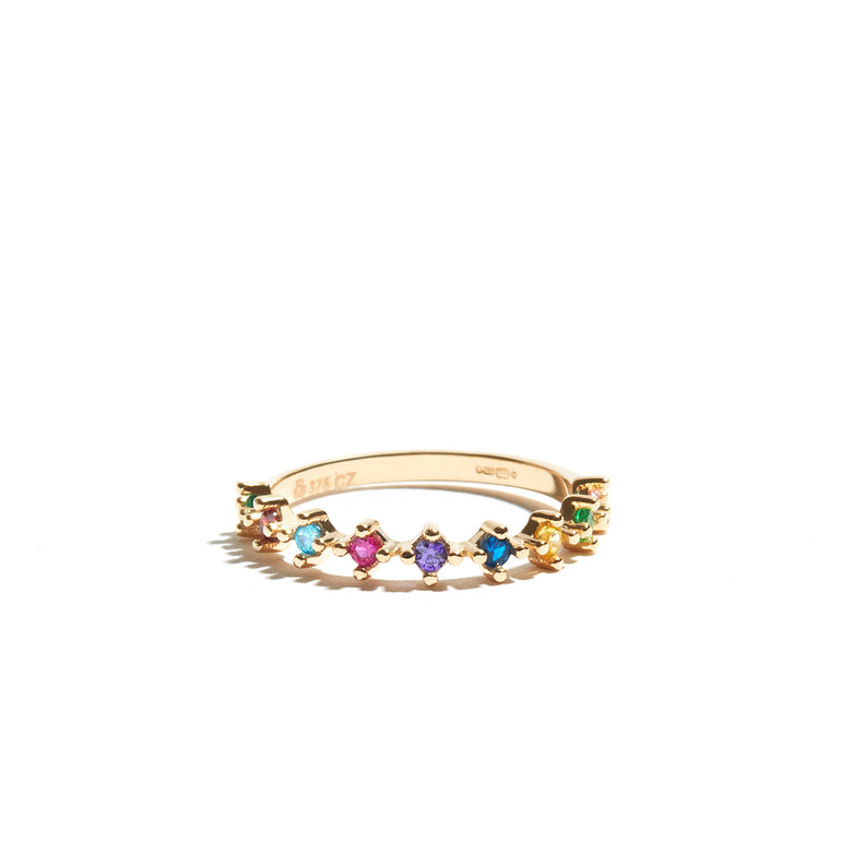 Add a splash of colour to your jewellery collection with this beautiful, delicate stacking ring featuring 9 little gems in rainbow colours.This is a great ring for stacking or a delicate, colourful option to let shine all by itself.