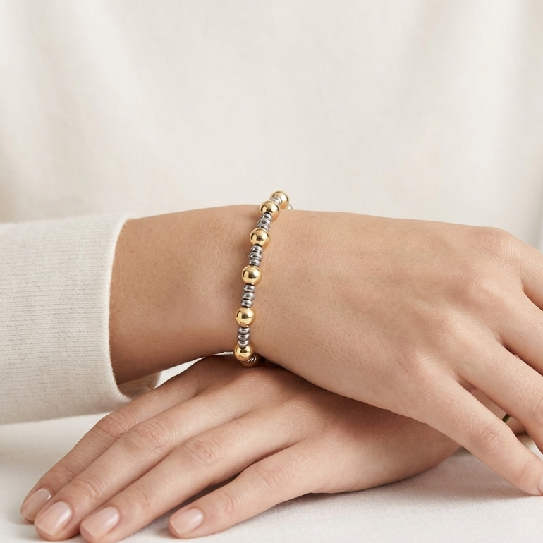 This elegant bracelet features a stunning blend of 14ct gold-filled and silver beads, offering a timeless and versatile design that adds a touch of sophistication to any look