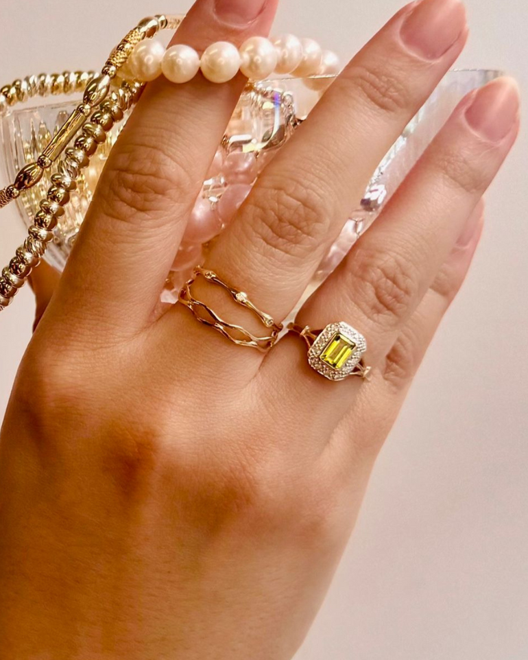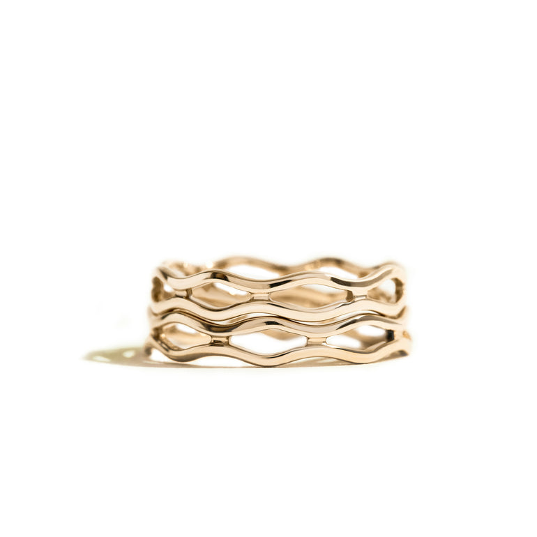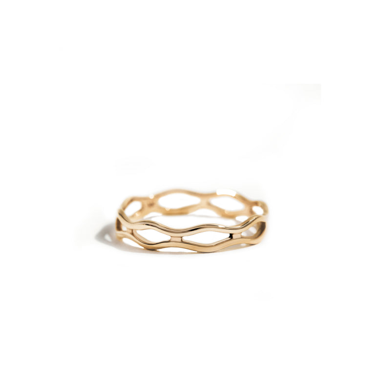 This elegant 9ct gold stacking ring features a delicate openwork design with smooth, oval-shaped links that create a light and airy feel. The ring's polished finish enhances its sophisticated look, making it perfect for stacking or wearing alone as a subtle statement piece. Its delicate yet modern design is versatile enough to complement any outfit, adding a touch of refined style to your jewellery collection. Ideal for everyday wear or layering with other rings, this dainty piece effortlessly combines simplicity and elegance.