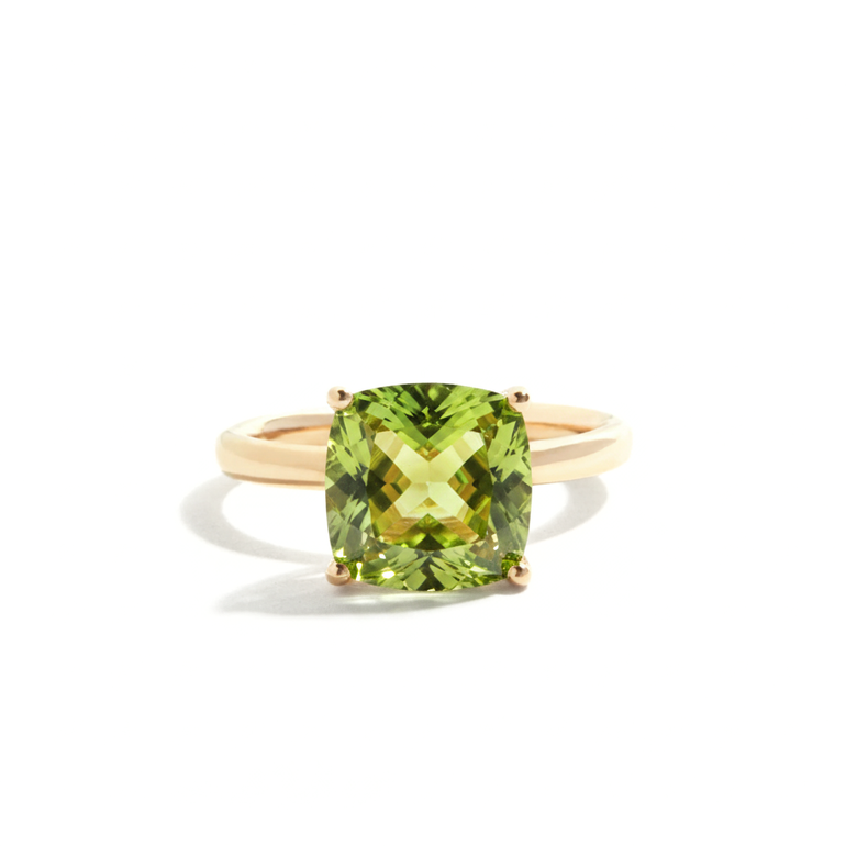 A bold pop of colour, designed to stand out. This cushion-cut peridot is set in solid 9ct gold, with crisp facets that catch the light and bring out its vivid green tone.