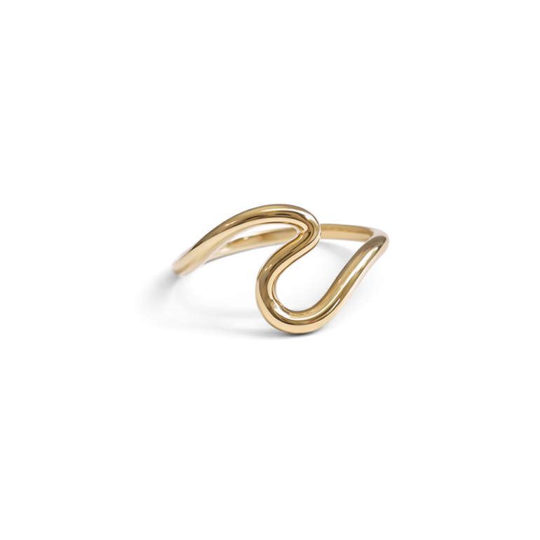 Fluid. Minimal. Effortless. This polished yellow gold ring curves into a soft, sculptural wave that wraps naturally around the finger. Its smooth, high-shine finish catches the light beautifully without needing stones. Modern simplicity at its best — perfect for stacking or making a quiet statement on its own.