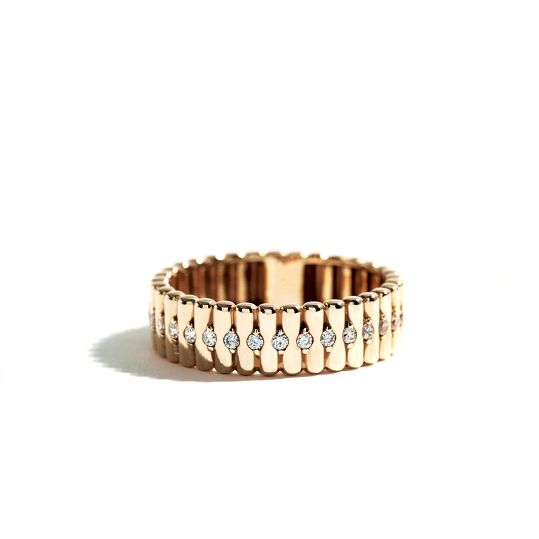 9ct yellow gold ring, featuring 16 sparkling round white cubic zirconia stones (CZ) set in a sleek, polished band. The linear arrangement of stones adds a touch of sophistication, while the claw setting ensures each stone is securely held. This elegant piece is perfect for adding a bit of shimmer to your everyday look or enhancing special occasions.
