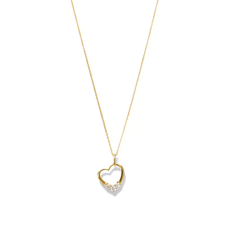 Express your love with this charming heart pendant, beautifully crafted from 9ct solid gold. The open heart silhouette is elegantly accented with three brilliant stones positioned at the base, creating a delicate sparkle that catches the light with every movement. This romantic piece hangs gracefully from a fine gold chain, making it the perfect symbol of affection for yourself or someone special. The timeless heart design combined with contemporary styling creates a versatile piece that transitions effortlessly from day to evening wear.