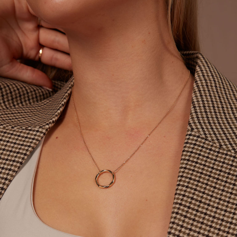 A unique spin on a classic circle pendant necklace, this 9 carat gold circle, on a delicate 9 carat gold, diamond cut chain, adds a little detail for a beautiful and timeless look.