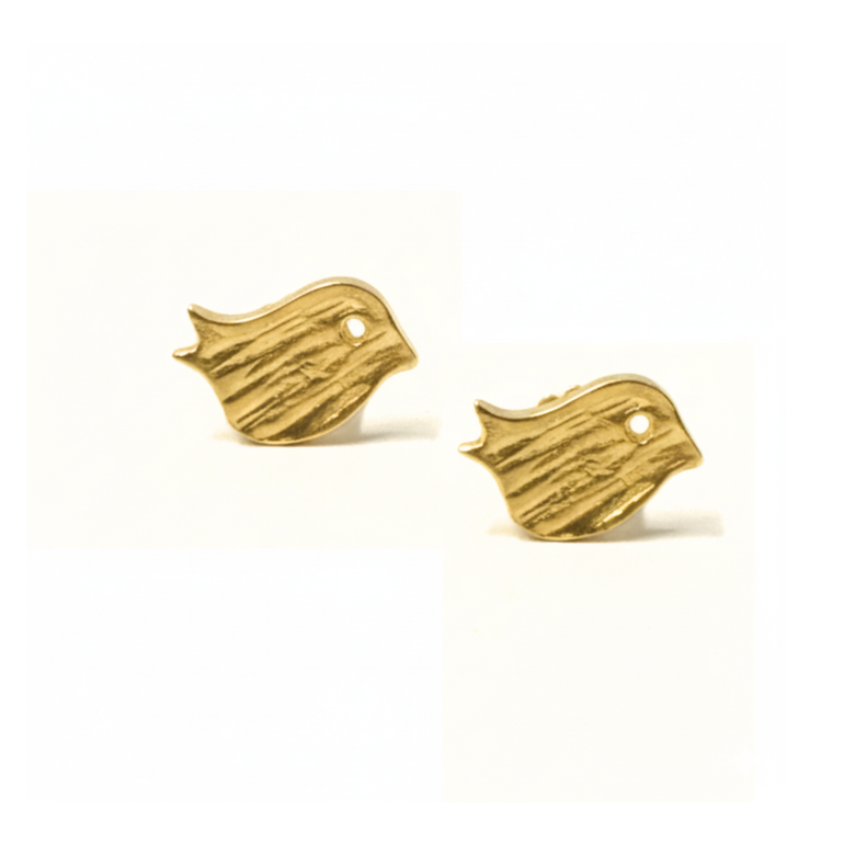Charming love birds stud earrings crafted in warm brushed gold finish. These adorable avian companions feature delicate textured detailing that captures the graceful lines of their feathers and wings, with a tiny accent dot forming each bird's eye.
