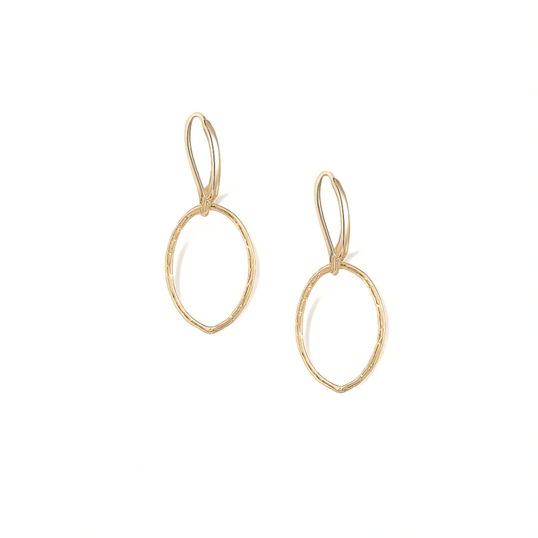 These elegant drop earrings feature delicate oval hoops with a beautiful hammered texture that catches and reflects light. Crafted from 14ct gold filled metal, they showcase a classic lever-back closure for secure and comfortable wear. The organic, hand-forged appearance of the hammered oval dangles creates visual interest while maintaining a timeless, versatile design that effortlessly transitions from casual to formal occasions. The warm golden finish and artisanal texture make these earrings a perfect addition to any jewelry collection, offering both sophistication and everyday wearability.
