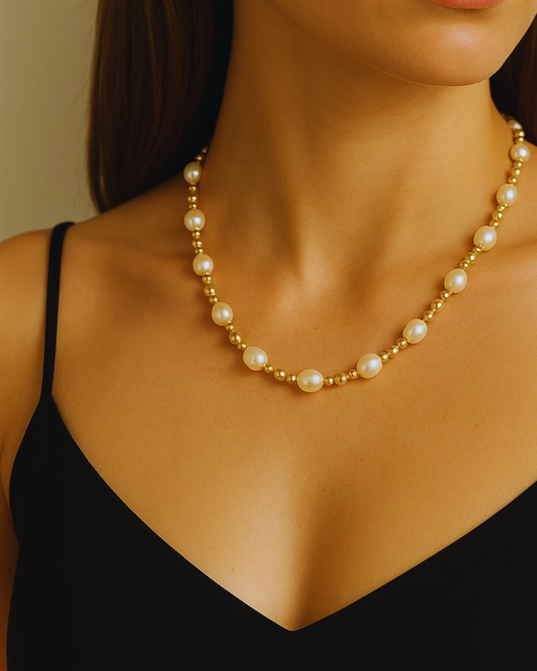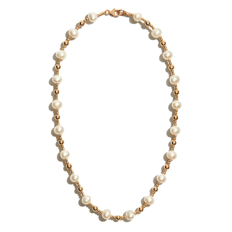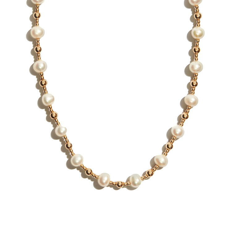 This gold pearl necklace is made from 14ct gold fill and fresh water pearls.