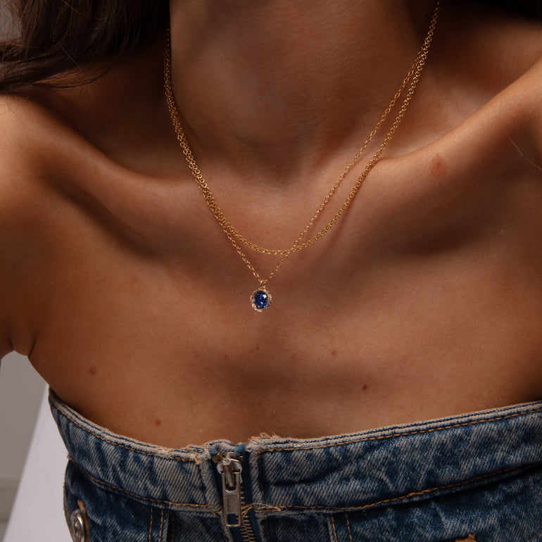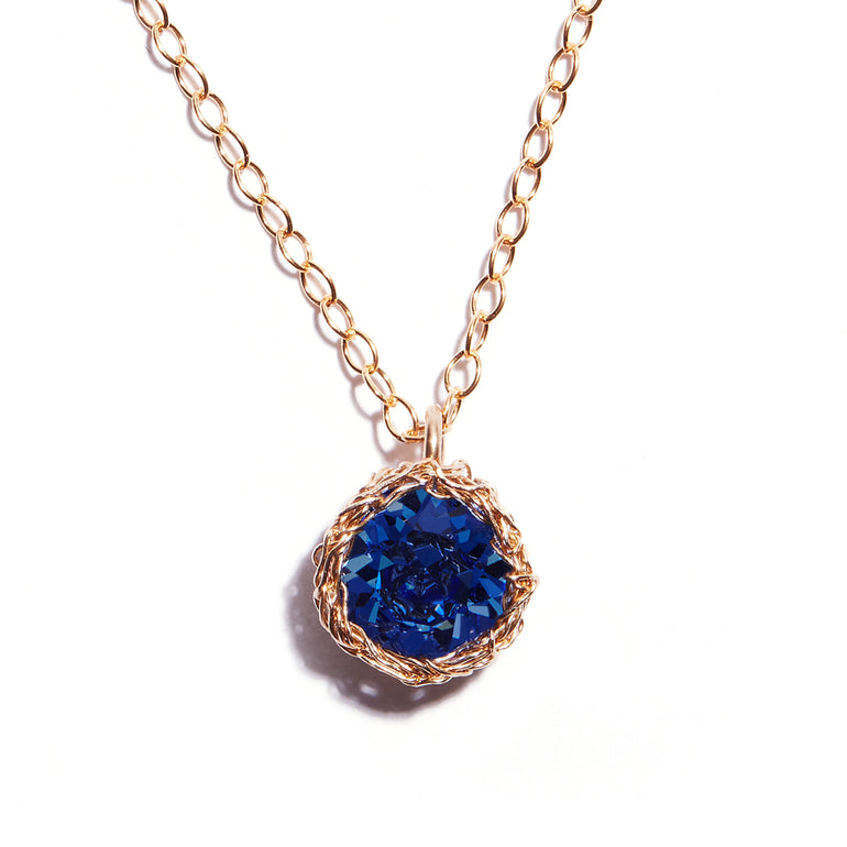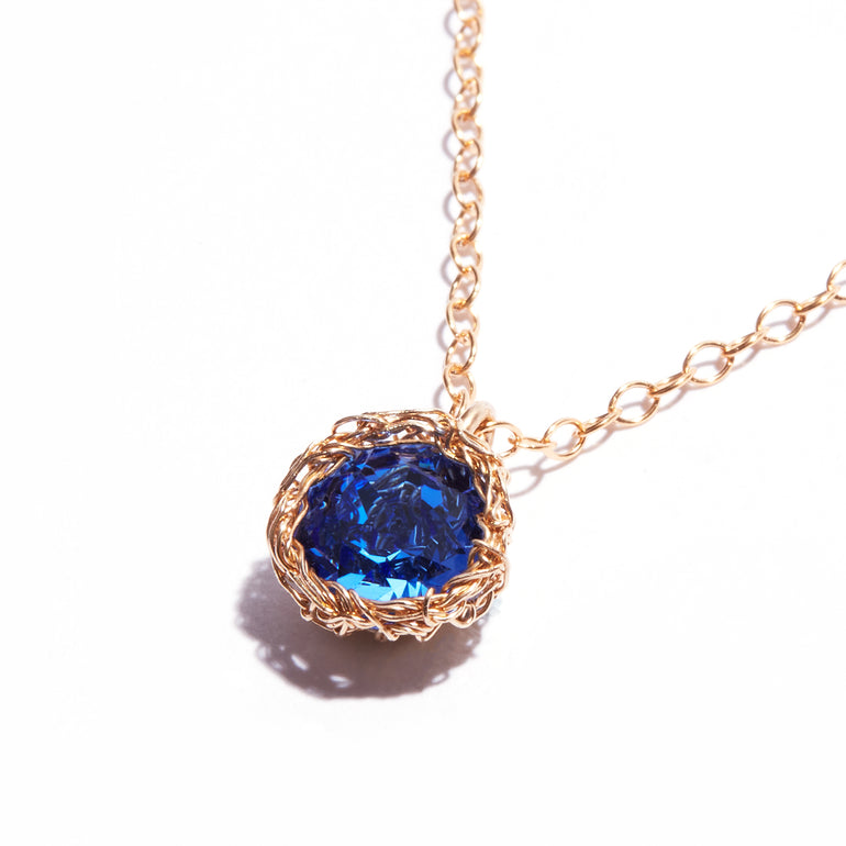 This Blue Sapphire Birthstone Pendant is made from 14ct Gold-Fill. It's design includes handwoven crochet surrounding a precision-cut crystal cubic zirconia.