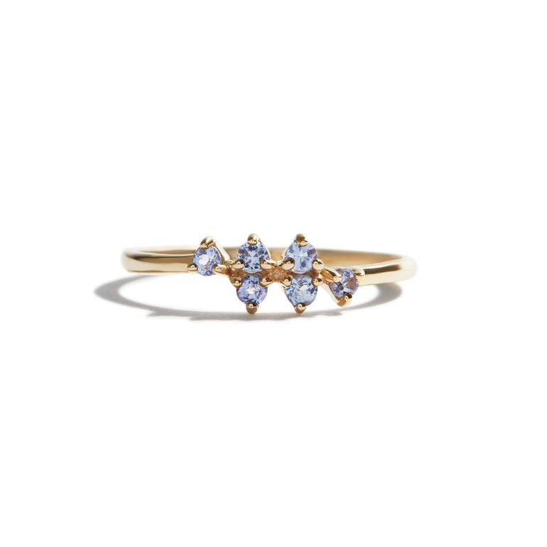 This gorgeous 9 carat gold ring features 6 delicate tanzanite stones on a simple gold wrapped band. It's perfect for stacking or as a beautiful delicate and dainty ring by itself.
